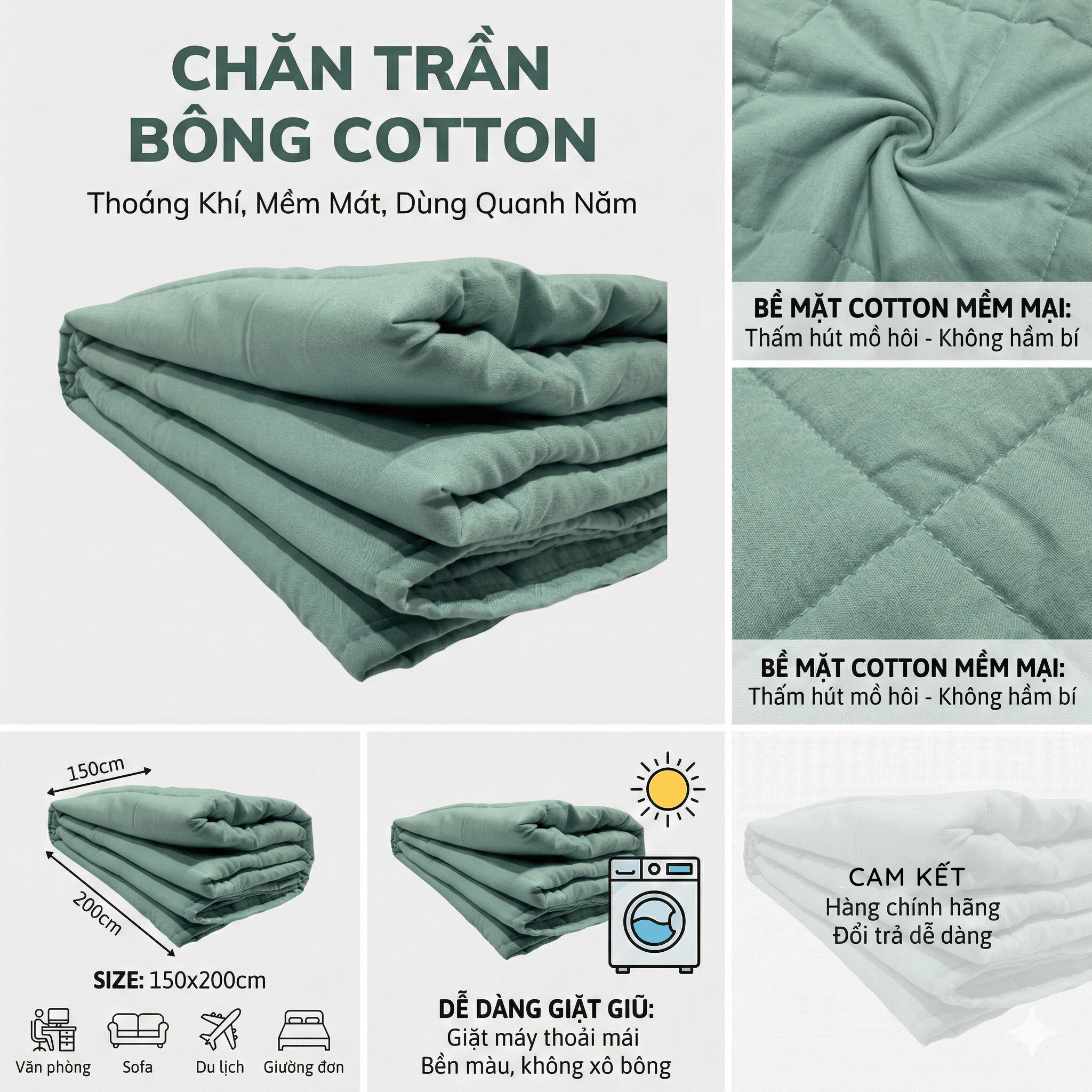 Chất liệu "Thở" được: Cấu trúc vải thoáng khí, thấm hút mồ hôi tốt. Phù hợp đắp trong phòng điều hòa mùa hè hoặc giữ ấm nhẹ nhàng vào mùa thu đông (dùng được quanh năm).